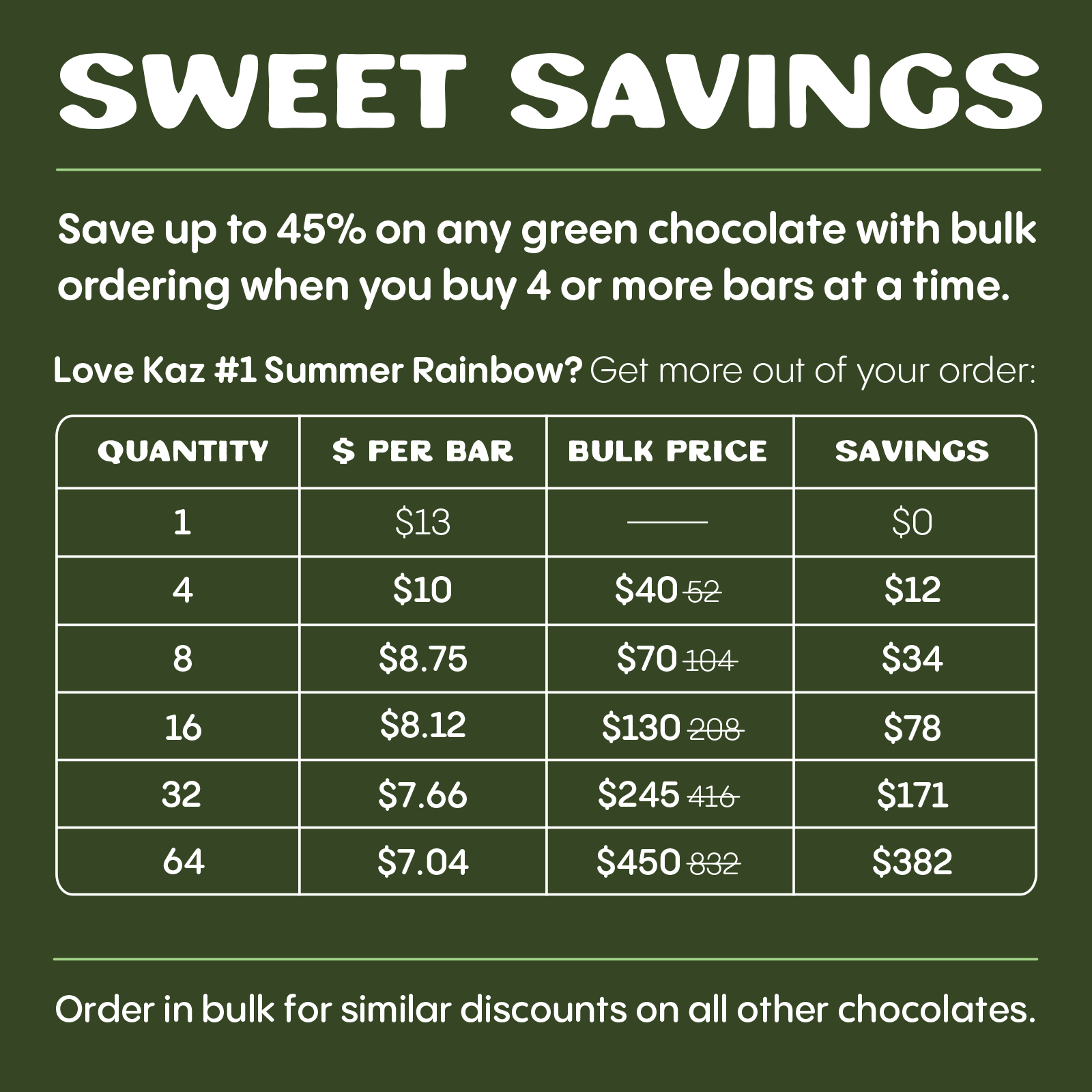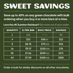 **Save up to 45% when you buy four or more Kaz #1 Summer Rainbow chocolates at a time. Price per chocolate lowers significantly as you increase the number of bars in your order. Similar discounts apply to all other chocolates.**